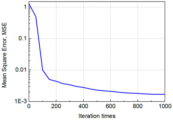 Results shown in Figure 14 and Figure 15 indicate that the performance of the MMBP algorithm is much better than the traditional RSS algorithm, where the average estimation error is significantly lowered by more than one magnitude from 14.34 cm to 1.88 cm. The accuracy along the x-axis is improved from 10.14 cm to 1.42 cm while that along the y-axis is improved from 8.55 cm to 0.88 cm. Figure 15 shows that the maximum positioning error for the traditional RSS algorithm is 26.66 cm and the error of 80% confidence is 19.31 cm. In comparison, with our proposed algorithm, the largest positioning error is only 5 cm, and the error of 80% confidence is reduced to 2.88 cm. The average positioning accuracy of MMBP algorithm is 7.6 times higher than the traditional RSS algorithm. Figure 16 shows the MSE performance with the arbitrary training data set. Compared with the results shown in Figure 10, after only 900 iterations, the mean square error of the proposed algorithm reaches the minimum value. Then we test the time cost of the algorithm and the results are shown in Table 5. We can find the positioning and training time with the arbitrary data set are only 0.005 s and 0.403 s, respectively, which are faster than the results with the even data set due to fewer hidden layer nodes and iteration times.