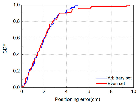 Cumulative distribution of positioning error for the arbitrary training data set and even training data set.
