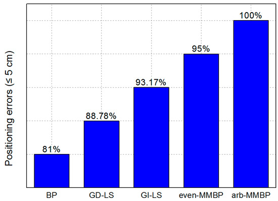 Comparison results of the probability of positioning errors being less than 5 cm using different algorithms are shown in Figure 18. Here we have used “arb-MMBP” to denote the MMBP trained by the arbitrary data set, and “even-MMBP” for that trained by the even data set. Comparing the performance of the five positioning systems, while the probability of positioning errors being less than 5 cm for BP, GD-LS, and GI-LS algorithms are only 81%, 88.78%, and 93.17%, respectively, that for the even-MMBP and arb-MMBP methods are as high as 95% and 100%. This suggests that our positioning accuracy is even better than the performance optimized by the GD-LS and GI-LS algorithms, which are verified by 225 training points utilizing the fingerprint base. It is to be noted that the size of our training set is only 20, which is 1/11 of that used for GD-LS and GI-LS in [15]. This is also the conclusion reached while comparing our results with [13], and the training set used in the BP method is 283 times larger than ours. In addition, the dimension of our positioning area is seven times larger than that in [15], and is the largest among the three systems. In a word, compared with the results in [13,15], we have achieved a higher positioning accuracy with the least training data in the largest positioning scenario. All of the above results indicate that the high-precision, easy-training and fast-convergent MMBP algorithm can be more widely adopted in practical scenarios.