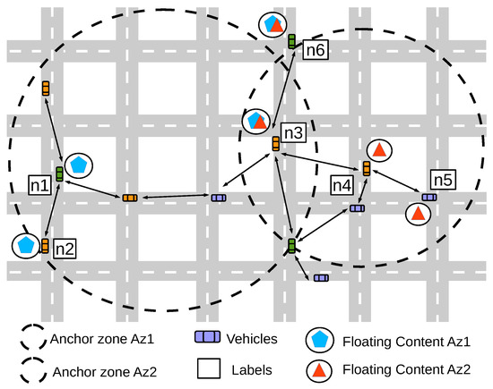 For each floating content object, IAN3I attributes an anchor zone () defined by a radius and centered at the critical area. Each is responsible for keeping the floating content objects alive within its area, making them available not only to vehicles within it, but also to vehicles approaching it. It is worth noticing that different s can have a different radius according to their needs [23,24].