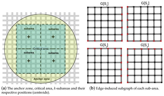 Figure 2 illustrates the main concepts discussed above. In particular, Figure 2a shows an , a critical area, its sub-areas and their respective positions.Moreover, Figure 2b shows the edge-induced subgraphs for each sub-area. The red vertices represent the common vertices of two subgraphs, i.e., the vertices that are used to join all subgraphs into a single one to represent the whole critical area.