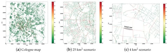 In this scenario, we study how the traffic efficiency of some areas degrade due to recurrent traffic congestion such as traffic congestion caused by high density of vehicles (rush hours). In other words, in this scenario, we simulate static critical areas. Figure 3a shows the entire TAPASCologne scenario colored according to the traffic condition at each road during the rush hour. As it can be seen, just some areas are affected by traffic injuries (e.g., critical areas). Therefore, we have selected a subset of ≈25 km2 from the TAPASCologne scenario, which contains a critical area with traffic efficiency problems. Figure 3b shows the 25 km2 subset selected, presenting the roads colored according to their traffic condition in the rush hour.