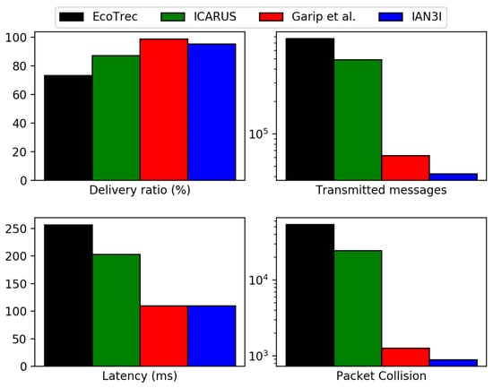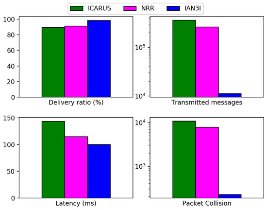 We can observe the same behavior in the unexpected traffic incident scenario (Figure 5), in which ICARUS and NRR do not employ any mechanism to either store traffic incident information close to its location or to forward it just to vehicles interested in it. Instead, they rely on periodic broadcasts to spread the unexpected traffic incident warning. Since IAN3I does employ such approach, it can reduce the messages transmitted, packet collisions and latency by up to , and respectively.