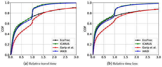 Since ICARUS and IAN3I use non-deterministic re-routing algorithms, they are able to avoid the limitations presented by Garip et al. and EcoTrec. Hence, they also decrease the travel time and time loss for approximately of the vehicles, of which less than impaired ones. However, for these cases, the increase in the travel time is less than 2 times of the original route.