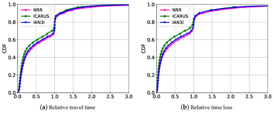Figure 6 and Figure 7 show the traffic efficiency for the relative metrics represented by a cumulative distribution function (CDF) for the recurrent traffic congestion and unexpected traffic incident scenarios, respectively.