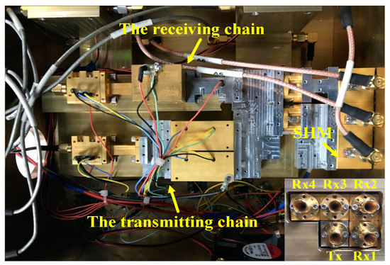 The echo signals are mixed using a sub-harmonic mixer (SHM) pumped by the local oscillator (LO) signal after power allocation in each channel, and the output of SHM is an IF signal with the center frequency of 0.72 GHz. In order to acquire the baseband signal, the IF signals of four channels are demodulated in four IQ demodulators and sampled by a high-speed ADC. The in-band noise figure and noise temperature are measured as 6–8 dB and 1200–2080 K, respectively, based on the Y factor method. The receiver bandwidth is 20 MHz and the receiver sensitivity is −80 dBm. The insertion loss and isolation of the power divider are 3 dB and 15 dB, respectively.