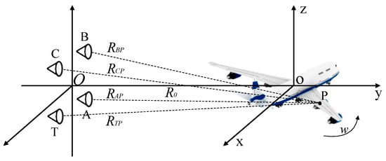 After range alignment and auto-focus processing [32,33], the InISAR imaging geometry can be simplified as turntable imaging model, and the geometry is shown in Figure 3. The antenna A, B, and C correspond to the antenna Rx1, Rx2, and Rx3 in Figure 2. Antenna T acts as the transmitter only, and antennas A, B, and C operate at the receiving mode only. A target coordinate system o-xyz is built on the target, where o denotes the center of turntable. ) is an arbitrary scattering point located on the target. denotes the vertical distance from coordinate origin o to the antenna plane, w denotes the rotation rate of target, and , , and denote the initial distances from P to four antennas, respectively. The coordinates of T, A, B, and C are , , and , respectively. The transmitting LFM pulse from antenna T is: