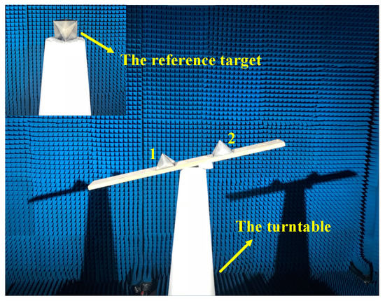 To test the feasibility of signal calibration method and resolution of the multi-channel THz radar system, an InISAR imaging experiment on two corner reflectors was carried out. The experimental scene are shown in Figure 4. In the experiment, the distance from antenna plane and turntable center is 4.1 m, the altitude difference of the two corner reflectors is about 7.2 cm, the pulse width is 160 μs, the pulse repetition frequency is 2500 Hz, the sample frequency is 12.5 MHz, the rotational rate of turntable is 90°/s, and the total rotation angle is 4°.