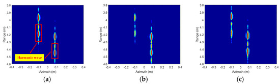 ISAR imaging results of two corner reflectors before signal calibration. (a) Antenna A; (b) Antenna B; (c) Antenna C.