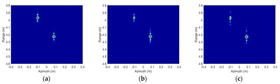 ISAR imaging results of two corner reflectors after signal calibration. (a) Antenna A; (b) Antenna B; (c) Antenna C.