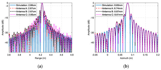 To show the resolution of the multi-channel THz radar system, the range profiles and azimuth profiles of the right corner reflector in three ISAR images and simulation results of an ideal point target under the same system parameters are shown in Figure 8. It can be seen that the theoretical range resolution and azimuth resolution are 2.66 cm and 8.65 mm with no use of data window, respectively. The actual range resolutions of three received channels are 2.67 cm, 2.67 cm, and 2.85 cm, and the corresponding azimuth resolutions are 8.74 mm, 8.87 mm and 8.61 mm respectively, which are very close to the theoretical value.