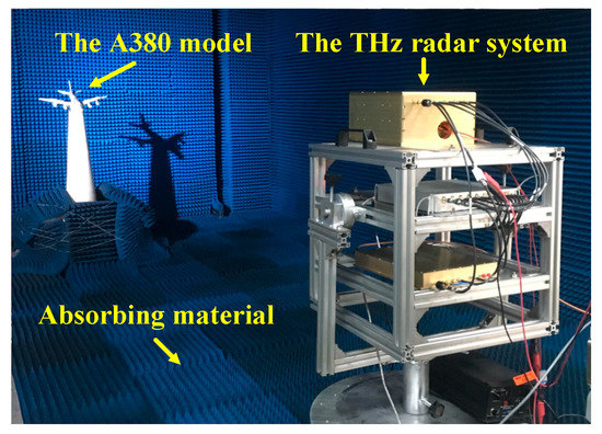 With the noticeable progress of THz sources and detectors over the past few decades, the imaging and recognition with THz radar systems becomes possible. Until now, THz radar imaging systems could be divided into three main categories: raster-scanning radar systems, mixed-scanning radar systems, and SAR/ISAR systems. A raster-scanning radar system uses several lenses to focus the beam onto a fixed area, and the image is obtained by recording the data of each scanning area when scanning along an object. One of the leading institutions in this area is the Jet Propulsion Laboratory (JPL, Pasadena, CA, USA). From 2006 to 2014, they presented serious radar systems with different operating frequencies and bandwidths, and achieved sub-centimeter resolution over a 4–25 m distance [2,6,7,8,9,10]. Another representative institution is the Pacific Northwest National Laboratory (PNNL, WA, USA). In 2009, they presented a standoff, three-dimensional (3-D) imaging prototype that operates near 0.35 THz [3,11]. This system allows screening at ranges of 2–10 m with sub-centimeter resolution, and can obtain an image in 10 s. The imaging frame rate of these systems is determined by the number of scanning pixels and oscillation frequency of the scanning mirrors, so it is time-consuming to acquire a target image. Furthermore, the system structure is complex and easily damaged.