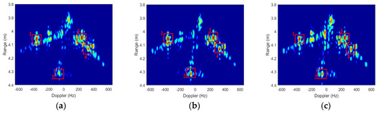 If the coherent accumulation angle θ is small enough to feed the range-Doppler imaging condition [20], the approximations , , , and are applied to further simplify the radar echo expression. Perform keystone transformation and 2-D Fourier transformation on the radar echoes, the target ISAR images of three received channels can be reconstructed as: