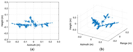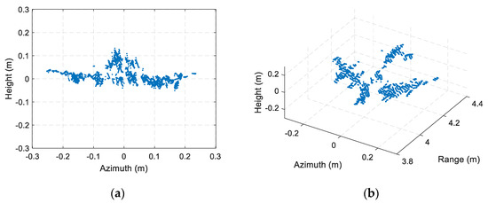 SAR/ISAR systems acquire the target image through relative motion between the radar and target [17,18,19,20]. The resolution depends on the bandwidth of sweep signal and the length or relative rotation angle of synthetic aperture. The Research Institute for High Frequency Physics and Radar Techniques (FGAN-FHR, Dortmund, Germany) has performed serious studies on SAR/ISAR imaging systems in the THz band. In 2007, they presented a 0.22 THz terahertz imaging radar system COBRA-220 which realized a 1.8 cm resolution at a distance of 135 m [21]. In 2013 and 2015, they continuously developed a 0.3 THz system and carried out SAR/ISAR imaging experiments on complex targets such as car and bicycle [4,22]. The system bandwidth is 40 GHz which realizes a 3.75 mm resolution. In 2012, the US Defense Advanced Research Projects Agency (DARPA, Arlington, Virginia, USA) presented the ViSAR program. The program aims to achieve moving targets tracking and imaging with video frame rate. They have carried out the ViSAR experiments with a 0.235 THz one-input four-output system, and obtained the real-time high-resolution SAR image of moving targets [23]. Beside the above two forerunners, other organizations also started to develop SAR/ISAR systems and many remarkable achievements had been made [5,24,25,26,27,28]. Compared to the other THz radar systems, the SAR/ISAR system has a relative simple system structure and low hardware cost, and has no limitation of target distance. However, The SAR/ISAR system can only capture the projected two-dimensional (2-D) characteristics of the target, which lose the altitude information.