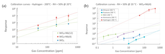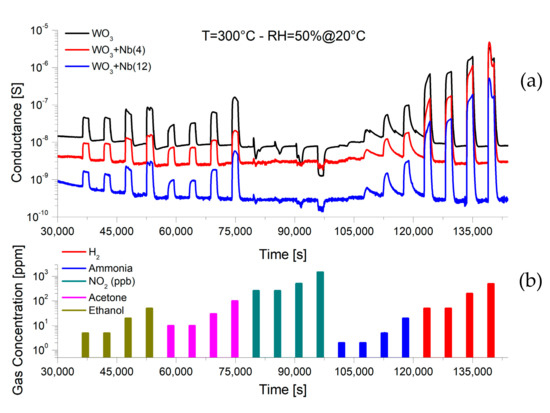 | WO3 + Nb(4) | Nanowires | 500 ppm | 200 °C | RH = 50% | ∆G/G = 8 × 104 | This work |