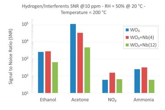 - Kruefu, V.; Wisitsoraat, A.; Phanichphant, S. Effects of niobium-loading on sulfur dioxide gas-sensing characteristics of hydrothermally prepared tungsten oxide thick film. J. Nanomater. 2015, 2015, 5. [Google Scholar] [CrossRef]