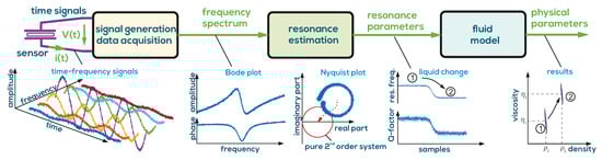 The processing of the data follows the measurement chain. A data acquisition system gives the frequency spectra which are processed by a resonance estimation algorithm. The resonance parameters are related to density and viscosity values and by a sensor model with predictable error propagation from measurement noise on the time signals.