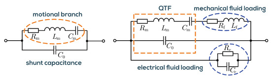 Left: Butterworth–Van Dyke equivalent circuit model for the unloaded quartz crystal tuning fork (QTF). The electro-mechanical resonance is modeled by the series resonant circuit termed motional branch with shunt capacitance in parallel accounting for the capacitance formed by electrodes and quartz material. Right: Liquid mass-loading and viscous drag are modeled by and . The conductivity and permittivity of the liquid in contact with the electrodes are modeled by and .