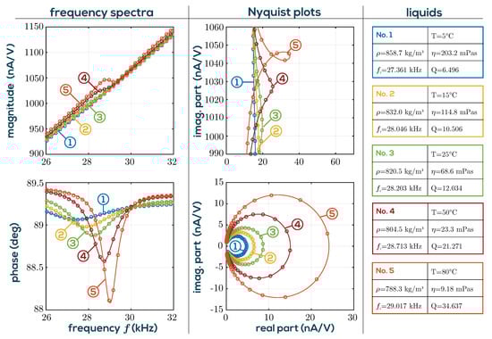 Frequency spectra of measured and fitted admittance signals for a silicone oil at varying liquid temperatures in the range from 5 °C to 80 °C are shown in the left two plots. The signals are dominated by the linear slope of in the magnitude, and only the small phase shifts indicate resonances. The above middle figure shows the associated Nyquist plots. In the lower middle figure, the background signals were subtracted, leaving only the motional branch admittance, which resemble circles. The solid lines are results of the resonance estimation algorithm, and the markers show the data points recorded using the system in Figure 6. On the right, the liquids corresponding to the labels (1–5) and the measured resonance parameters are listed.