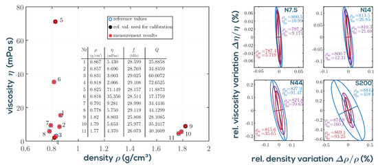 Left: The fluid model in Equation (4) is adjusted using three fluid standards (filled dots No. 4, 5, and 9). The calibration is verified for eight additional fluids. Right: Relative deviations due to measurement noise. Error ellipses showing three times the standard deviation are plotted for fluid standards (N7.5, N14, N44, and S200 from Cannon) at three different temperatures each. Units of density and viscosity are kg/m3 and mPas, respectively.