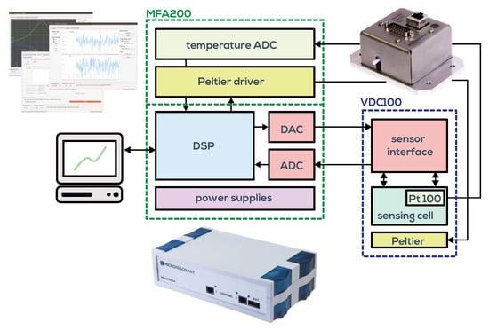 Schematic of the measurement system. The viscosity-density cell VDC100 is connected to the universal resonance analyzer MFA200. The graphical user interface suite of the MFA200 is used for test cycle automation and post processing.