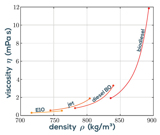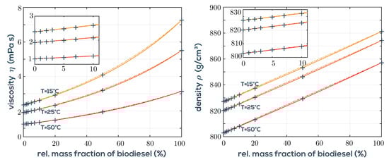 In Figure 8, viscosities and densities of diesel mixtures are shown for three temperatures and the mixing models given in Equation (6) and Equation (7) are plotted as solid lines.