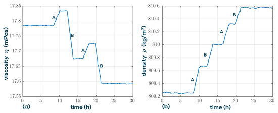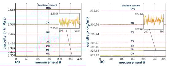 The quantities denoted with subscripts 0 and 100 represent B0 diesel and pure biodiesel (B100), respectively, and is the mass fraction of biodiesel ranging from 0 to 1. The logarithm ln of viscosity follows a simple binary mixture model based on the Grunberg–Nissan model [49]. Here, the mass fractions are used instead of the usual mole fractions, which gives better agreement in this application. The parameter accounts for a small curvature and is adjusted for best fit to = {0.071, 0.069, 0.066} ln(Pas) for the three temperatures T = {15, 25, 50} °C, respectively. For density, a similar model applies with curvature parameter = {3.6, 3.8, 4} kg/m3. Figure 8 also shows the results with and as dash-dotted lines, which indicate that in the low mass fraction range, reasonably good results without fitting for and can be obtained. Figure 9 shows the time series of each measurement consisting of 300 consecutive raw measurements. It is emphasized that these data points are completely independent. No a priori knowledge of previous data is used to calculate the actual data point. This means that there is no filtering or averaging being used, which leaves plenty of headroom for more sophisticated signal processing. Given the low noise of the measured data, the standard deviations of the mass fraction calculated from density () and viscosity () are approximately given for the three temperatures in the low mass fraction range of 0 to 10% by
