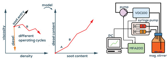 Left: diesel and soot entry influence viscosity and density differently and can therefore be calculated using a fluid model. Various operating conditions at the engine test stand can therefore be evaluated online. Right: Schematic of the laboratory test setup for concept evaluation.