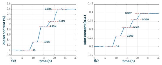 Viscosity (a) and density ((b) of engine oil for two different dilution scenarios A and B. Soot increases viscosity and density, but diesel reduces viscosity, as shown in Figure 10. Both scenarios introduce diesel and soot, but at different ratios.