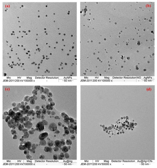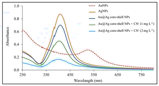 - Zeng, J.B.; Cao, Y.Y.; Chen, J.J.; Wang, X.D.; Yu, J.F.; Yu, B.B.; Yan, Z.F.; Chen, X. Au@Ag Core/Shell Nanoparticles as Colorimetric Probes for Cyanide Sensing. Nanoscale 2017, 6, 9939–9943. [Google Scholar] [CrossRef]
