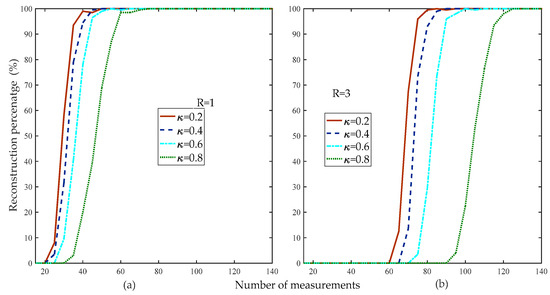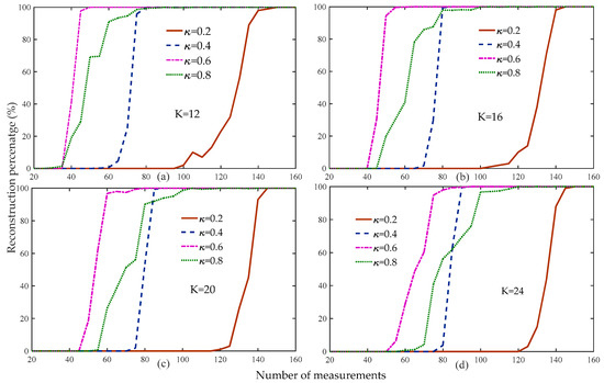 Figure 3 compares the reconstruction percentage of the proposed algorithm to the different thresholds. Figure 3 shows that when the threshold was 0.6, the reconstruction percentage of the proposed algorithm was the highest compared to the other thresholds under the same measurements and sparsity levels.