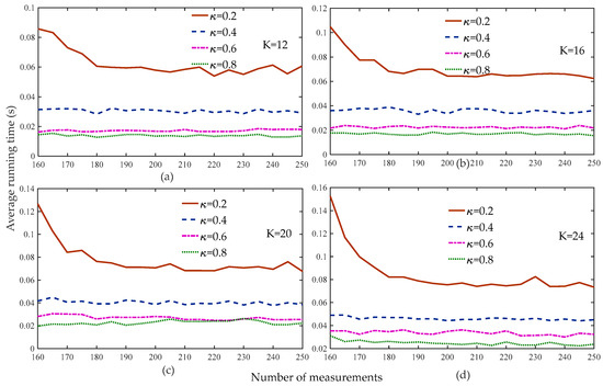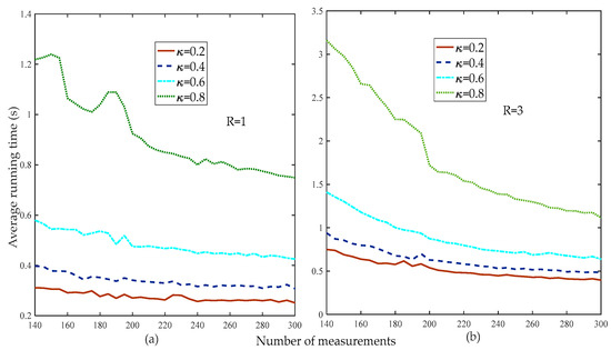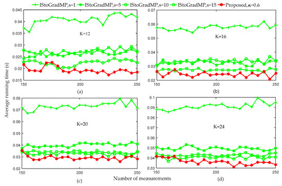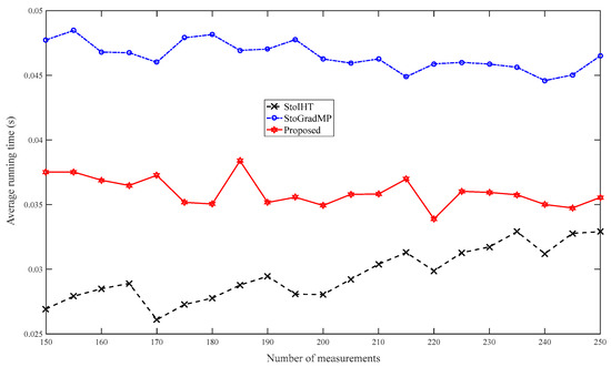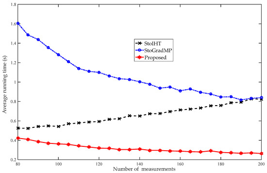 Figure 14 compares the average running times of the different algorithms. Figure 13 shows that when the number of measurements was more than 80, the reconstruction percentage of all the algorithms was 100%. Therefore, to better analyze the computational complexity of the different algorithms, we set the range of measurements to in the simulation. Figure 14 shows that the proposed algorithm had the shortest running time, followed by the StoIHT and StoGradMP algorithms. We observed that when the number of measurements increased, the running time of the StoIHT algorithm also increased, whereas the average running times of the proposed and StoGradMP algorithms tended to decrease and remain stable.