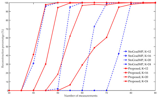 Figure 5 compares the reconstruction percentage of the proposed algorithm using the StoGradMP algorithm. We set the sparse level to , and the weak selection threshold to 0.6. Figure 5 shows that when the sparse level was 12, the reconstruction percentages of the proposed algorithm and the StoGradMP algorithm were nearly identical for all the measurements. When , 20, or 24, the reconstruction percentage of the proposed algorithm was higher than that of the StoGradMP algorithm. When the sparse level was 24, the difference in the reconstruction percentages between the two algorithms was the largest. Therefore, we concluded that when the sparse level increases, the difference between the reconstruction percentages increases further. This means that in sparse signal reconstruction, the proposed method is more suitable for reconstruction in a larger sparsity environment compared to the StoGradMP algorithm.