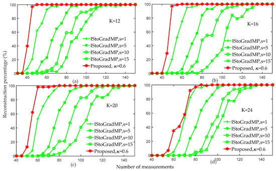 Figure 8 shows that for arbitrary measurement values, the reconstruction percentage of the proposed algorithm was higher than that of the IStoGradMP algorithm. However, we discovered that as the sparsity level increased, the gap in the reconstruction percentage between the proposed algorithm and the IStoGradMP algorithm gradually reduced. This means that the proposed method is more suitable than the IStoGradMP algorithm under smaller sparsity environments.