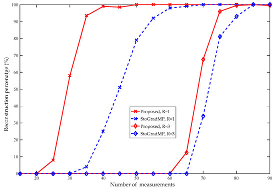 Figure 6 compares the reconstruction percentage of the proposed algorithm with the StoGradMP and StoIHT algorithms. In Figure 5, the interval of measurement was set to five, and to reflect the details, we set the interval of measurement to two in Figure 4. Figure 6 shows that when , the reconstruction percentages of the methods were 0%. This means that they could not complete the reconstruction. When , the reconstruction percentage of the proposed method ranged from 0.2% to 97.6%; however, the reconstruction percentages of the StoGradMP and StoIHT algorithms were still 0%. When , the reconstruction percentage of the StoGradMP algorithm began to increase from 0.6% to 95%. When , the reconstruction percentages of the proposed and StoGradMP algorithms were nearly 100%. However, the StoIHT algorithm was still unable to complete reconstruction. When , the reconstruction percentage of the StoIHT algorithm increased from 0% to 100%. When , then all the reconstruction algorithms could achieve full reconstruction. This demonstrates that the proposed method provides better reconstruction performance than the others.