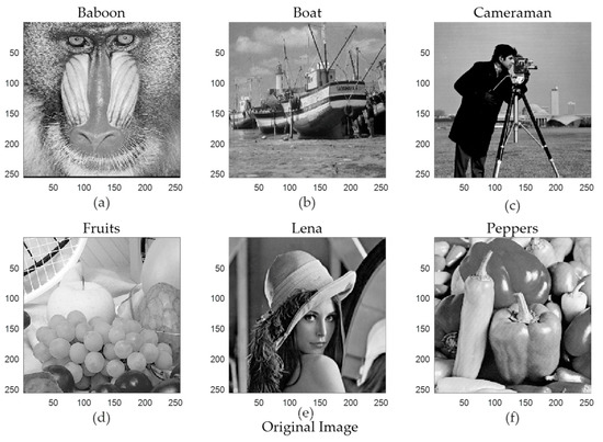 Original images (a) Baboon image, (b) Boat image, (c) Cameraman image, (d) Fruits image, (e) Lena image, (f) Peppers image.