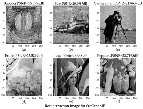 Table 1 compares the average PSNR of the StoGradMP and proposed algorithms under different test image conditions. Table 1 shows that the average PSNR of the proposed algorithm was higher than the StoGradMP algorithm for the different test images, and the average PSNR of the proposed method was higher than 3–4 dB. This shows that the reconstructed image quality of the proposed algorithm was better than the StoGradMP.