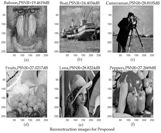 Reconstructed images using the proposed algorithm (a) Reconstructed Baboon image with PSNR = 19.4619 dB; (b) Reconstructed Boat image with PSNR = 24.4034 dB; (c) Reconstructed Cameraman image with PSNR = 28.8105 dB; (d) Reconstructed Fruits image with PSNR = 27.0217 dB; (e) Reconstructed Lena image with PSNR = 28.8224 dB; (f) Reconstructed Peppers image with PSNR = 27.2669 dB.