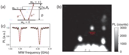 Figure 5b is a fluorescence picture taken by EMCCD with an exposure time of . The metal strip line on the top surface blocked the fluorescence from the NV center, as shown in Figure 5b. Rough detection of the MW magnetic field was carried out by comparing the signals with and without the resonant MW magnetic field applied []. At a zero magnetic bias field, the NV ground electron spin energy splitting was 2.87 GHz. Taking pictures of the same region as in Figure 5b with an MW field of 2.87 GHz applied, the NV fluorescence brightness decreased in the vicinity of the metal strip line (data not shown). The signal contrast decreased with the distance between NV centers and the MW strip line.