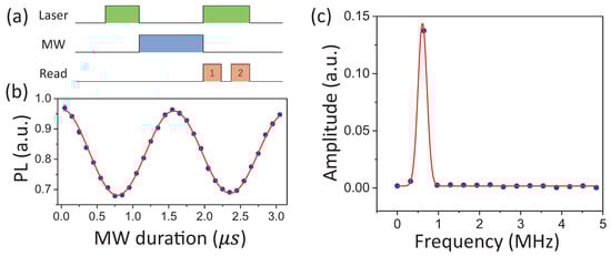 To conduct polarization selective MW magnetic field sensing, a bias magnetic field was applied to split the resonant spectra lines corresponding to and transitions. In our experiment, a bias magnetic field of about 500 G was applied. As shown in Figure 2c, the optically-detected magnetic resonance (ODMR) spectra revealed an energy level splitting of 2.86 GHz between the state and state. Although the MW field from the signal generator was linearly polarized, the transition was only sensitive to the MW field when the MW magnetic field strength was not too strong according to the rotating wave approximation in quantum optics []. We implemented the measurement of the strength of the circularly-polarized component of the MW magnetic field with the NV center by detecting Rabi frequency. The MW field frequency was adjusted in resonance to the transition. The Rabi frequency detection sequence is shown in Figure 3a. A laser pulse was firstly applied to initialize the NV electron to the ground state. Then, an MW manipulation pulse was inserted. Finally, the population of the electron spin state was detected by another laser pulse. To obtain the manipulation frequency of the MW field, the MW pulse varied in time duration. Moreover, a photon count read pulse-2was applied after the NV center was polarized to the state again to provide a reference for drifts of the NV center. Figure 3b shows the Rabi oscillation detected with the MW field source power of about 7.8 mW applied. The oscillation signal was fitted by . The manipulation frequency of 0.63 MHz indicated the polarized MW magnetic field strength of G at the NV center spot perpendicular to the NV axis. According to the fitting error of G and detecting time of s of the Rabi nutation curve, the sensitivity for MW field detection was . The Rabi oscillation frequency can also be derived by Fourier transformation (Figure 3c).