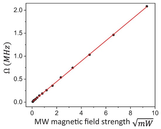 As , , the Rabi frequency increased linearly with the square root of the resonant MW field power. The linear dependence was verified by detecting Rabi oscillation signals with different MW field powers applied. Figure 4 shows the linear dependence of Rabi frequency on microwave magnetic field strength. This is consistent with the measurement principle.