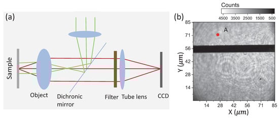 For wide-field detection of the MW magnetic field, the experiment was based on a home-built wide-field back focal imaging microscope system. As shown in Figure 5a, the green laser was focused at the back focal area of the object () to illuminate the sample with collimated light. The red fluorescence emitted by ensemble NV centers at the focal plane was collected by the same objective and was separated from the source light by a dichroic mirror. Then, the light was filtered and focused on an EMCCD (Andor Ultra iXon 897, Oxford, UK) for imaging. The spatial resolution of the microscope system was about 700 nm, as the wavelength of fluorescence emitted from the NV center was roughly between 600 nm and 750 nm. The sample used in this experiment was a general single crystal (100)-oriented CVD diamond from Element Six company with inherent ensemble NV centers. The inherent NV concentration in the diamond was estimated to be about (2 ppb) by comparing the fluorescence photon counts of the NV centers in the diamond to that of a single NV center in type-IIa diamond under the confocal microscope system. The fluorescence emitted from the diamond was ascribed to the NV center according to its zero photon line at 637 nm detected by the spectrometer FHR 640 (data not shown). A metal micro-strip line with a width of m was fabricated on the top surface of the diamond to deliver the microwave field.