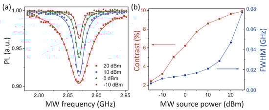 Taking pictures of the same region while scanning the MW frequency applied to the strip line, the ODMRsignal of the region can be extracted. To verify the wide-field MW magnetic field sensing method, ODMR signals of Spot A were extracted with the MW magnetic fields of different source powers P transmitted to the MW strip line (Figure 6a). Obviously, the magnetic resonance signal contrast increased with the power of the MW field applied, as the red square in Figure 6b indicates []. Thus, simply by tuning the NV electron spin transition frequency in resonance with the MW field, the qualitative MW magnetic field strength of specific polarization and spread direction [] can be determined from the NV fluorescence signal contrast. Besides, the blue dot in Figure 6b shows that the full width at half maximum (FWHM) of the NV magnetic resonance signal decreased with reduced MW source power till a threshold value. The minimum FWHM of NV ODMR spectra reflects the NV electron spin decoherence property []. Moreover, the NV axial directions in the diamond were the same as the four tetrahedral diamond axes []. The MW magnetic field spread along each NV axis can be detected. Thus, the axial ratio of an MW field spread along an arbitrary direction can be extracted. Further applying the Rabi measurement sequence in the wide-field microscopy system, precise detection of MW magnetic field strength and the axial ratio is attainable [,].