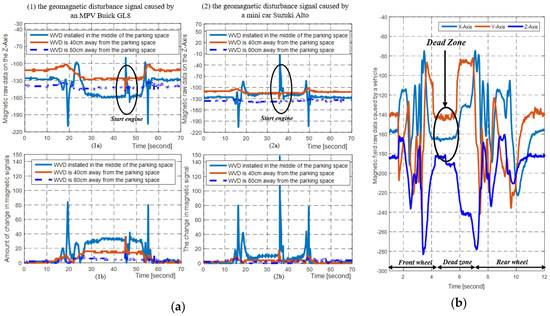 The raw magnetic data collected by the magnetic sensor 3D MagIC. (a) The magnetic disturbance data collected by the magnetic sensors at different distances during a vehicle parking process, and the sampling rates of magnetic sensors are 20 Hz; (b) The magnetic disturbance signals obtained by the magnetic sensor when an MPV Buick GL8 slowly passes over a magnetic sensor, and the magnetic sensor sampling rate is 100 Hz.