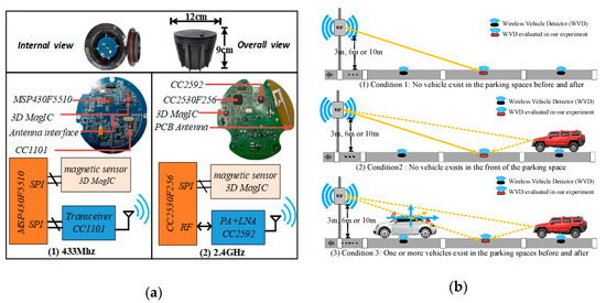 The hardware setups and different evaluation scenarios. (a) The hardware implementation of two types of wireless vehicle detector prototypes; (b) Three different evaluation and verification scenarios.