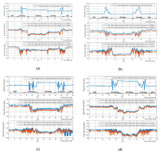 The raw magnetic raw data and raw RSSs affected by vehicle parking processes, and the tested vehicle is an MPV Buick GL8. (a) The WAP antenna is 3-meter-high and there are no vehicles in the parking spaces between WAP and WVD as the scenario shown in Figure 3b1; (b) The WAP antenna is 3-meter-high and there are some vehicles in the parking spaces between WAP and WVD as the scenario shown in Figure 3b3; (c) The WAP antenna is 6-meter-high and there are some vehicles in the parking spaces between WAP and WVD as the scenario shown in Figure 3b3; (d) The WAP antenna is 10-meter-high and there are some vehicles in the parking spaces between WAP and WVD as the scenario shown in Figure 3b3.