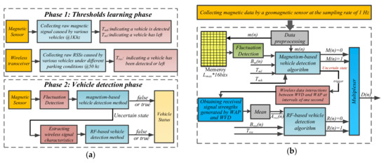 According to the above analysis, if the amount of change in the magnetic signals is greater or less than the decision threshold, it can be considered that a vehicle has been detected or left, and this method will be called “magnetism-based method”. Similarly, if the amount of change in the received signal strengths is greater or less than a given threshold, a vehicle can be considered detected or left too, and we named this method “RF-based method”. We implemented our vehicle detection method in two phases, and the overview of our proposed vehicle detection method as shown in Figure 5a.