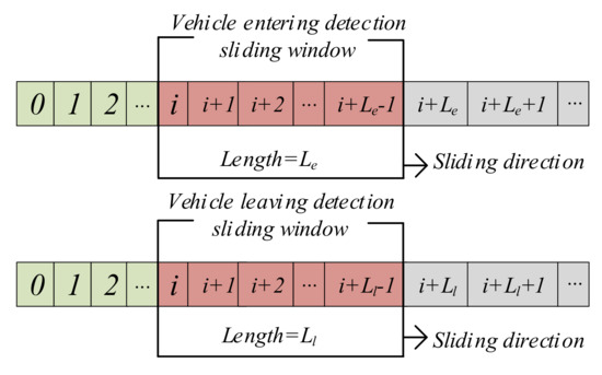 From Figure 2a, we can find that the magnetic signals are easily affected by adjacent moving vehicles, which may cause the vehicle state to be misjudged. In order to reduce the false detection probability caused by the interference from the adjacent moving vehicles, two detection windows shown in Figure 6 are introduced: vehicle entering detection sliding window and vehicle leaving detection sliding window . Through the analysis of the general driver parking habits before, the vehicle entering detection sliding window size is 180 s and the vehicle leaving detection sliding window size is 120 s in our proposed method.