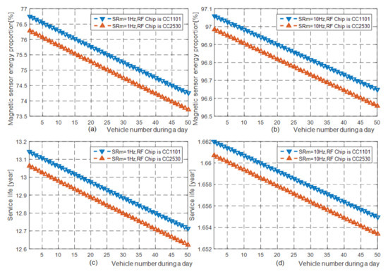 From Figure 7a,b, we can see that the energy consumption of the magnetic sensor accounts for a large proportion of the total energy consumption. In other words, the total energy consumption increases rapidly with the improvement of the magnetic sensor sampling rate, and vice versa. In summary, the above experiment results show that if the sampling rate of the magnetic sensor is reduced, the total energy consumption of the vehicle detector can be greatly reduced, so that the service life of vehicle detectors can be extended.