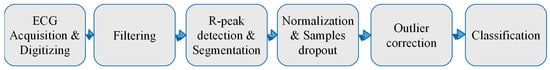 The ECG identification process typically consists of three main stages: data acquisition, data processing (filtering, normalization, and feature extraction) and pattern matching (classification) [4,7,8,12,13].